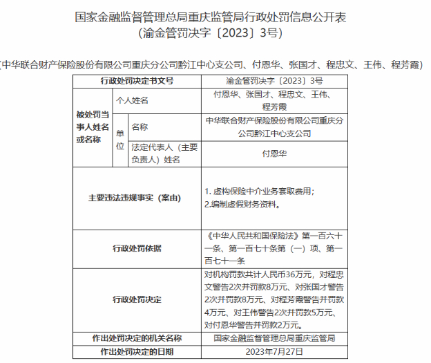 中华联合财产保险股份有限公司重庆分公司黔江中心支公司因虚构保险中介业务套取费用、编制虚假财务资料被罚36万元;程忠文被警告2次并罚款8万元、张国才被警告2次并罚款8万元、程芳霞被警告并罚款4万元、王伟被警告2次并罚款5万元、付恩华被警告并罚款2万元。