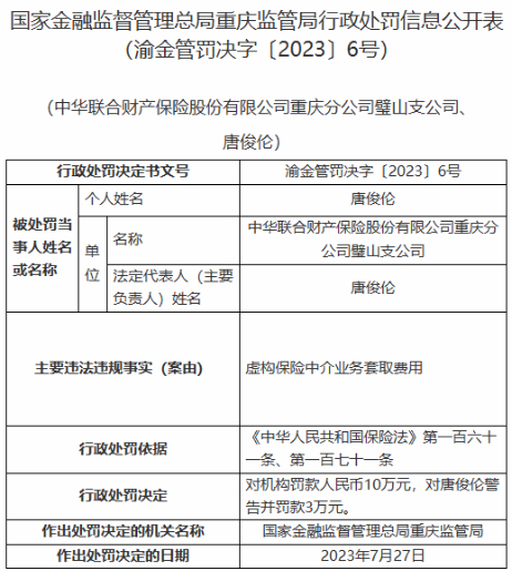 中华联合财产保险股份有限公司重庆分公司璧山支公司因虚构保险中介业务套取费用被罚10万元;唐俊伦被警告并罚款3万元。