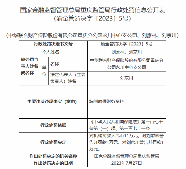 中华联合财产保险股份有限公司重庆分公司永川中心支公司因编制虚假财务资料被罚11万元;刘家林被警告并罚款1万元、刘京川被警告并罚款1万元。
