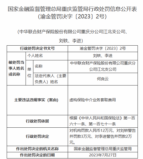 中华联合财产保险股份有限公司重庆分公司江北支公司因虚构保险中介业务套取费用被罚12万元;刘轶被警告并罚款3万元、李进被警告并罚款2万元。