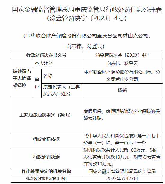 中华联合财产保险股份有限公司重庆分公司秀山支公司因虚假承保、虚假理赔骗取农业保险的保险费补贴被罚160万元;同时向志伟被警告并罚款10万元、蒋登云被警告并罚款10万元。