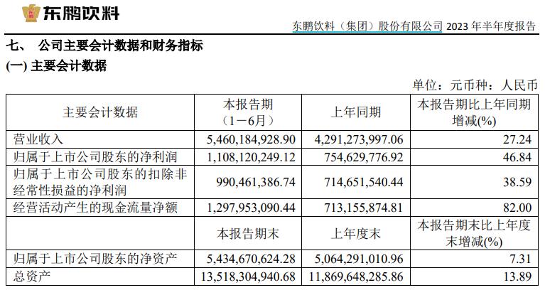8月6日晚,东鹏饮料(集团)股份有限公司(以下简称东鹏饮料)发布2023年半年报,上半年,该公司营收、净利双增长,实现营业收入54.6亿元,同比增长27.24%;净利润11.08亿元,同比增长46.84%。