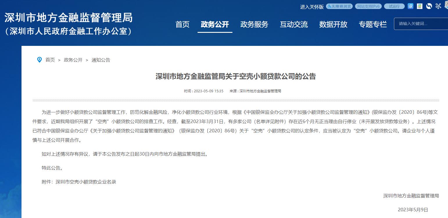 5月9日,深圳市地方金融监督管理局公告显示,经查,截至2023年3月31日,有多家公司存在近6个月无正当理由自行停业(未开展发放贷款等业务)。上述情况已符合原中国银保监会办公厅《关于加强小额贷款公司监督管理的通知》关于“空壳”小额贷款公司的认定条件,应当被认定为“空壳”小贷公司。