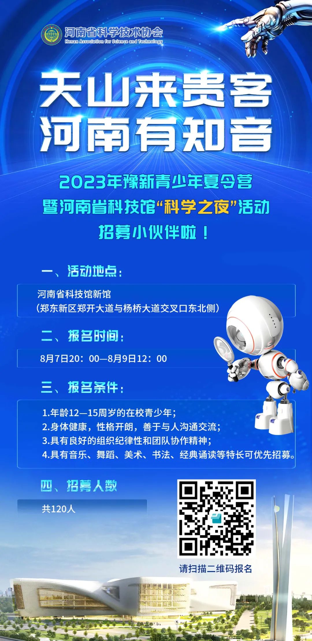 为丰富活动内容,促进豫新两地青少年团结友爱,同感科学魅力、共享科技成果,推动形成讲科学、爱科学、学科学、用科学的良好氛围,河南省科协特招募120名年龄在12~15周岁在校青少年共同参加,招募时间为8月7日20:00~8月9日12:00,可通过河南省科协、河南省科技馆微信公众号登录查看报名。