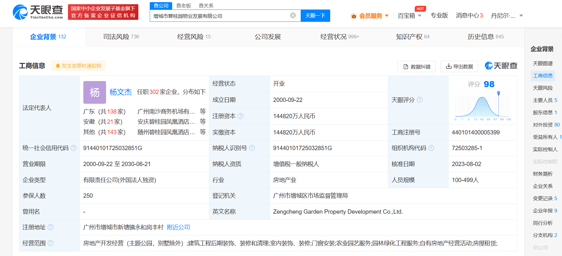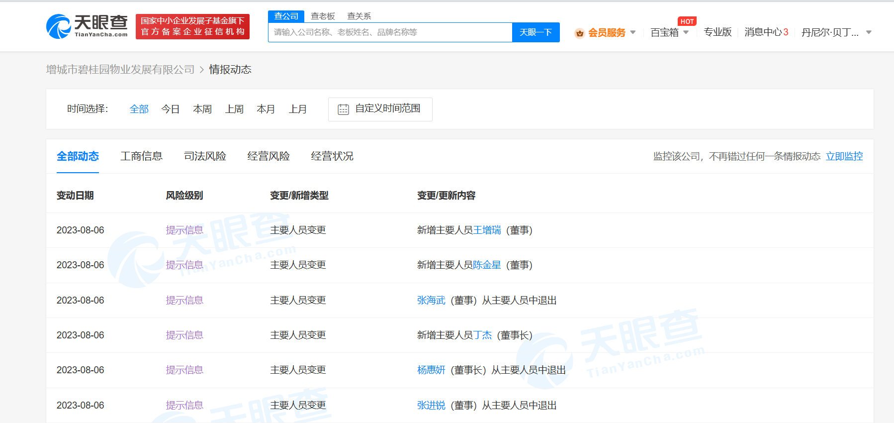 【大河财立方消息】天眼查App显示,近日,增城市碧桂园物业发展有限公司发生工商变更,杨惠妍卸任董事长,由丁杰接任。同时,张进锐、张海武不再担任董事,新增王增瑞、陈金星为董事。