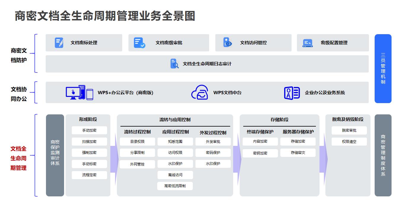 金山办公“WPS Office商密方案”在此次大会亮相,该方案是金山办公推出的一款商密文档全生命周期管理建设方案,覆盖文档加密定密、分块加密存储、内部安全流转、访问权限管控、外发安全保护、文档脱密和销毁等商密文档全生命周期的安全防护。