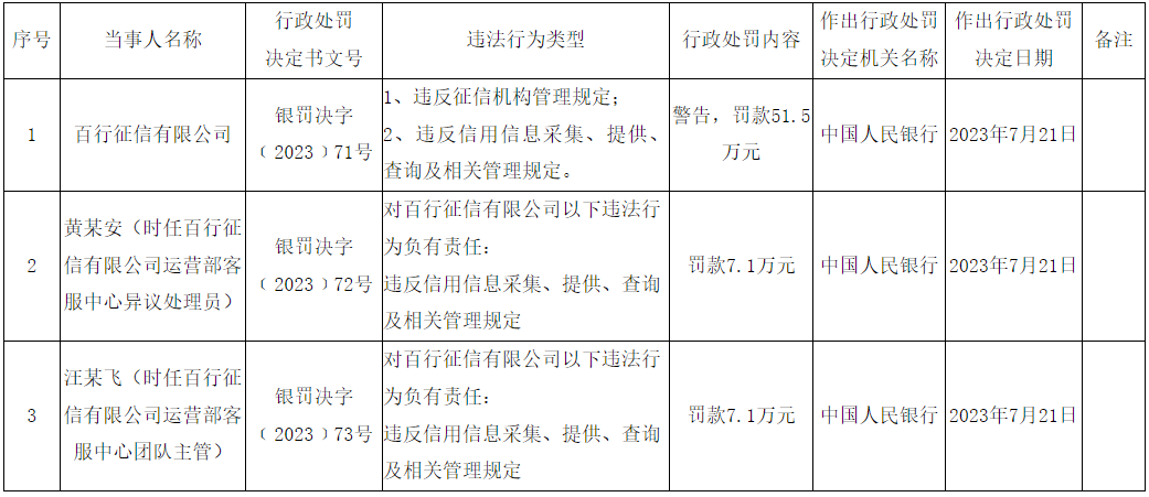 行政处罚信息显示,时任百行征信有限公司运营部客服中心异议处理员黄某安,和时任百行征信有限公司运营部客服中心团队主管汪某飞,对百行征信违反信用信息采集、提供、查询及相关管理规定行为负有责任,分别被罚7.1万元。