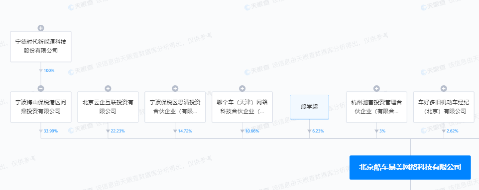 【大河财立方消息】天眼查App显示,近日,查博士关联公司北京酷车易美网络科技有限公司发生工商变更,新增股东宁德时代旗下宁波梅山保税港区问鼎投资有限公司,持股33.99%,同时该公司注册资本由约309.07万人民币增至约468.24万人民币。目前,宁波梅山保税港区问鼎投资有限公司为该公司第一大股东。