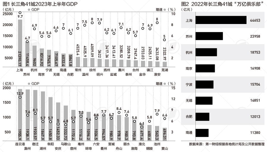 第一财经记者梳理公开数据发现,长三角41城中,共有8个城市的上半年GDP超5000亿元,6市增速达到或超过8%。