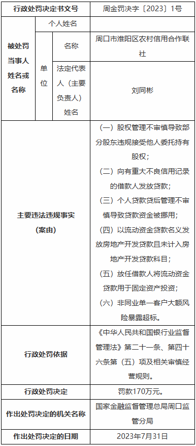 依照相关规定,周口市淮阳区农村信用合作联社被处罚款170万元。