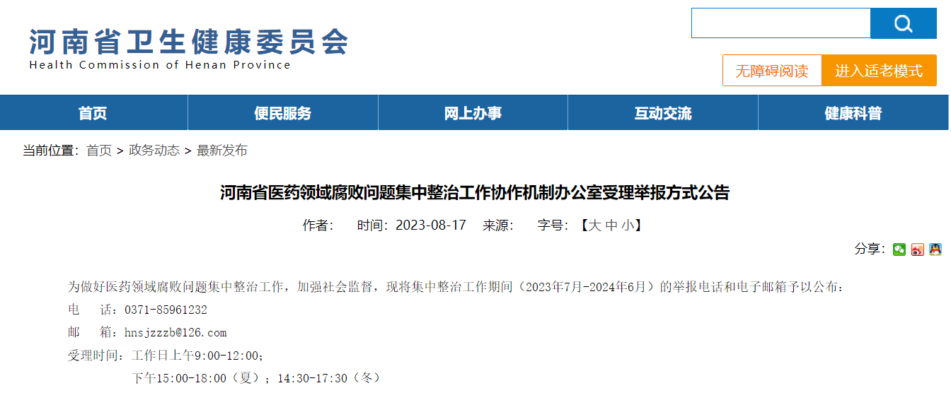 【大河财立方消息】8月17日消息,为做好医药领域腐败问题集中整治工作,加强社会监督,河南省医药领域腐败问题集中整治工作协作机制办公室公布集中整治期间(2023年7月~2024年6月)的举报电话和电子邮箱。