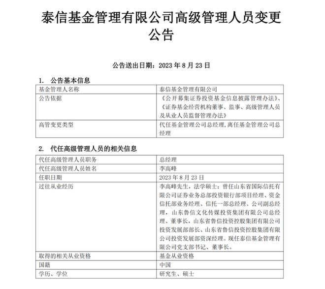8月23日,泰信基金发布高级管理人员变更公告称,公司总经理高宇因个人原因离任,由公司董事长李高峰代任总经理职务,任职日期为8月23日。