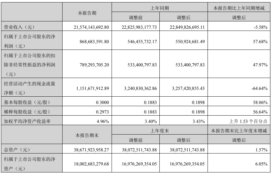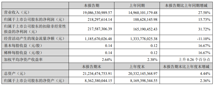 韵达股份公告称,上半年营业收入215.74亿元,同比减少5.58%;归母净利润8.69亿元,同比增长57.68%;基本每股收益0.3元。公司计划不派发现金红利,不送红股,不以公积金转增股本。报告期,公司累计完成快递业务量84.02亿票,市场份额达到14.12%;二季度单票毛利、单票净利同比环比双升。