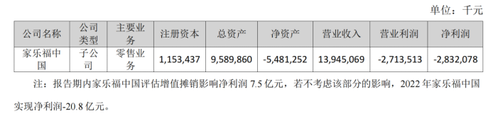 2020~2022年,苏宁易购因国内家电零售市场受到冲击,营收连续三年下滑,曾在公告中表示无法继续向家乐福供血。财报显示,2020~2022年,家乐福中国净利润分别为-7.95亿元、-33.37亿元、-20.8亿元。
