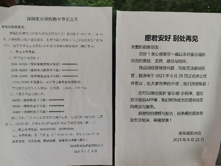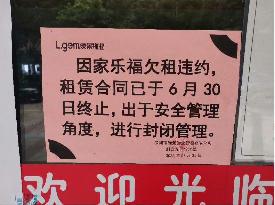 此外,7月31日,家乐福新洲店所属的深圳市绿景物业管理有限公司绿景花园管理处张贴公告“因家乐福欠租违约,租赁合同已于6月30日终止,出于安全管理角度,进行封闭管理”。