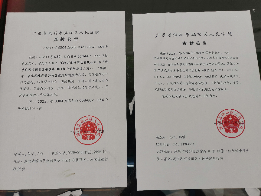 值得注意的是,门上还贴有两张广东省深圳市福田区人民法院的查封公告。公告指出,依法查封深圳家乐福商业有限公司、深圳家乐福商业有限公司中心城店、深圳家乐福商业有限公司新洲店的现场物品;依法查封深圳家乐福商业有限公司名下位于深圳市福田区福强路3018号绿景花园二期一、二层卖场,仓库区域存放的物品以及新洲店内物品。