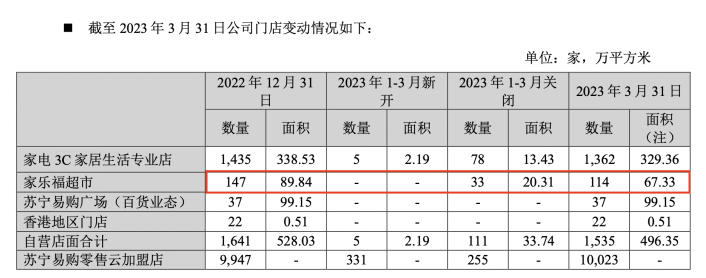 苏宁易购2022年年报显示,2022年家乐福在国内关闭了58家门店;2023年一季度,又关闭了33家门店。截至3月底,国内仅存114家门店。关停区域集中在上海、福建、北京、广东等地。