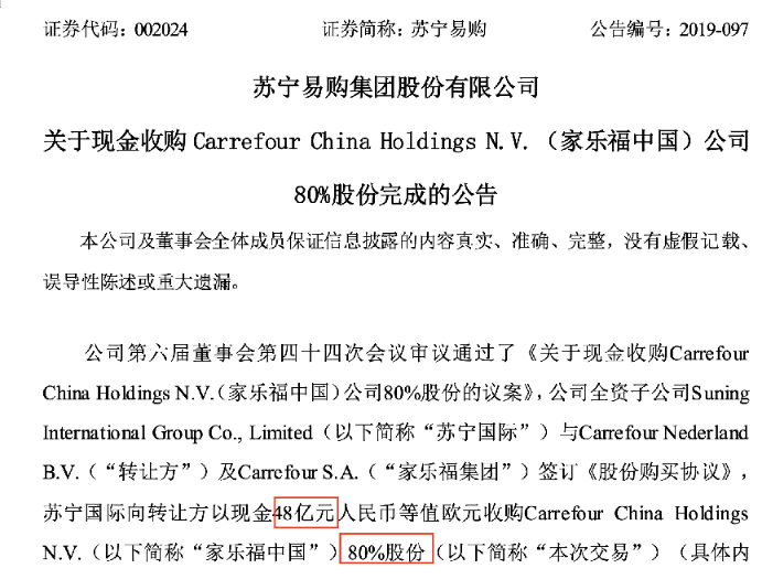 2019年,家乐福遇到了急于转型的苏宁易购,双方一拍即合。同年9月,苏宁易购全资子公司苏宁国际以48亿元收购家乐福80%的股份。