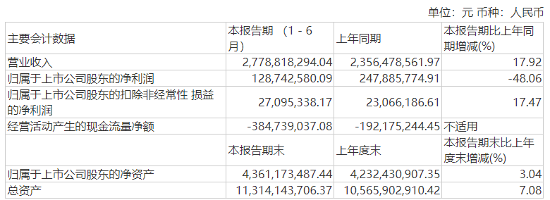 【大河财立方消息】8月30日晚间,凯盛新能发布半年报称,上半年归属于母公司所有者的净利润1.29亿元,同比减少48.06%;营业收入27.79亿元,同比增长17.92%;基本每股收益0.2元,同比减少47.37%。