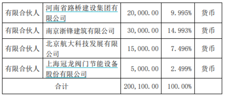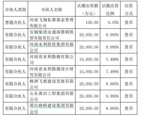 公告显示,基金注册规模20.01亿元,各合伙人认缴方式均为货币出资,其中有限合伙人永通公司认缴2亿元、河南水利投资集团有限公司认缴2亿元、河南省水利勘测有限公司认缴1.5亿元、河南省水利勘测设计研究有限公司认缴1.5亿元、株洲飞鹿建设发展有限公司认缴2亿元、山东黄河工程集团有限公司认缴2亿元、邢台路桥建设集团有限公司认缴2亿元、河南省路桥建设集团有限公司认缴2亿元、南京浙锋建筑有限公司认缴3亿元、北京航大科技发展有限公司认缴1.5亿元、上海冠龙阀门节能设备股份有限公司认缴0.5亿元;普通合伙人河南飞翔私募基金管理有限公司认缴0.01亿元。