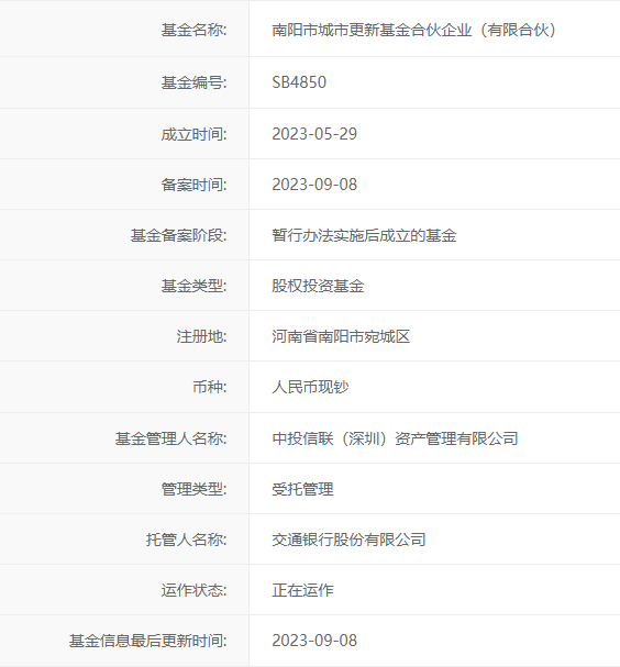 【大河财立方消息】9月11日消息,南阳市城市更新基金合伙企业(有限合伙)已于日前在中基协完成备案。