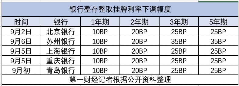 9月1日,6家国有大行和多家股份行更新存款参考利率表,1年期、2年期、3年期和5年期定期存款利率分别下调10BP、20BP、25BP和25BP。