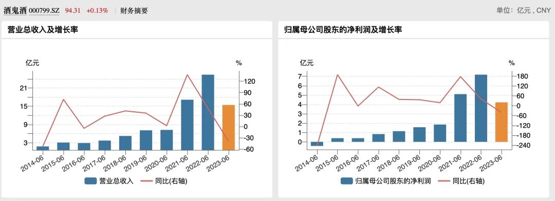 连续8年的高速增长之后,酒鬼酒在2023年上半年遭遇最大“挫折”,尽管有如此多前缀头衔的加持,但其半年报业绩难让投资者高兴起来。2023半年报显示,今年1~6月期间,酒鬼酒实现营业收入15.41亿元,同比下降39.24%;实现净利润为4.22亿元,同比下降41.23%;经营活动产生的现金流量净额为0.83亿元,同比下降72.35%。