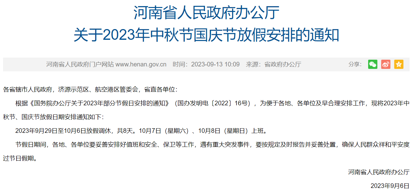 【大河财立方消息】9月13日消息,河南省人民政府办公厅日前印发通知,明确2023年中秋节、国庆节放假日期安排。