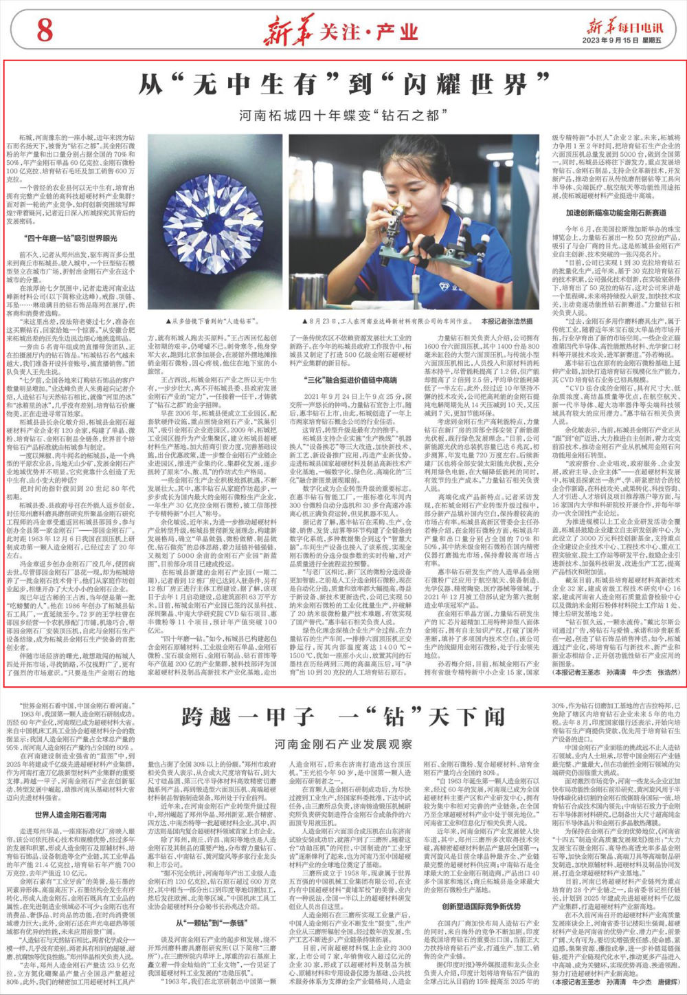 余化敏表示,当前,柘城县金刚石产业正从“跟”到“创”迈进,大力推进自主创新,着力攻克前沿技术,推动金刚石产业从机械用金刚石向功能用金刚石转型。