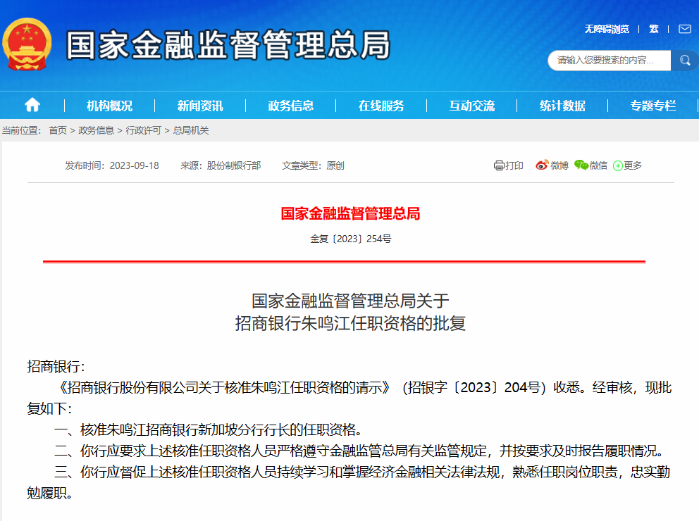 金融监管总局批复!朱鸣江出任招商银行新加坡分行行长