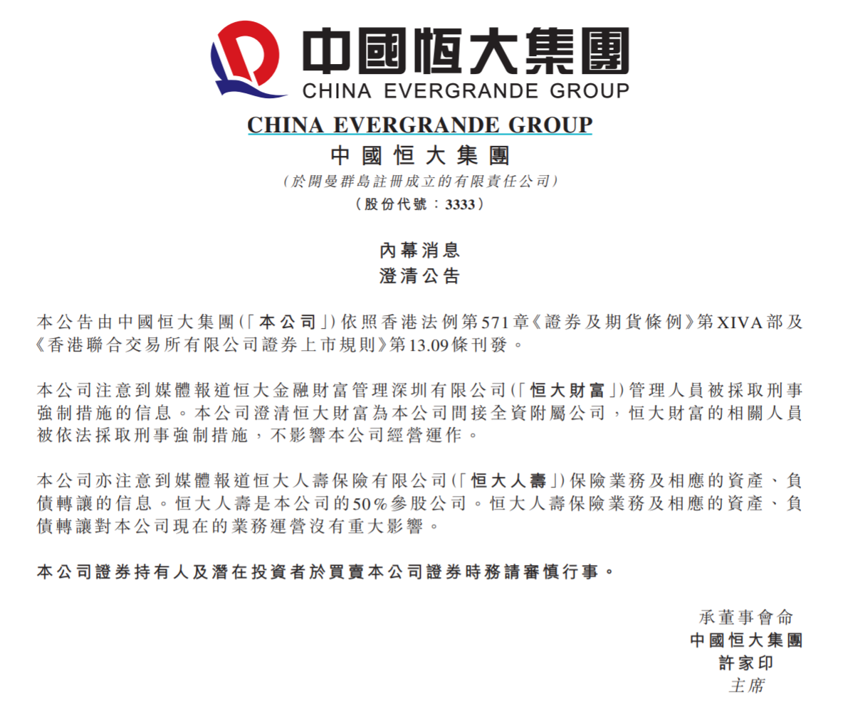 【大河财立方消息】9月18日晚间,中国恒大公告称,公司注意到媒体报道恒大金融财富管理深圳有限公司管理人员被采取刑事强制措施的信息。恒大财富为公司间接全资附属公司,恒大财富的相关人员被依法采取刑事强制措施,不影响公司经营运作。