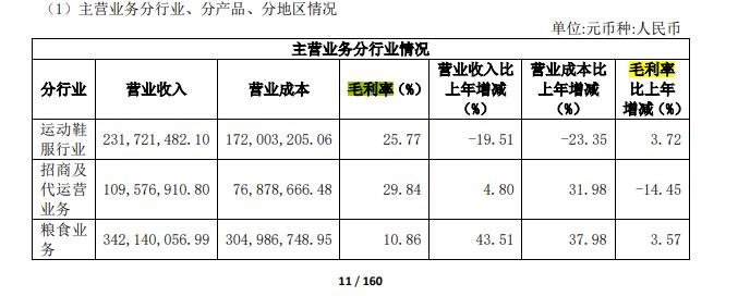 财报数据显示,ST运动鞋服业务毛利率为25.77%、招商及代运营业务毛利率为29.84%,而粮食业务毛利率仅为10.86%。