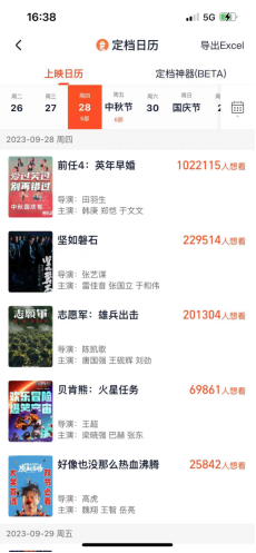 大河财立方记者统计发现,截至9月24日,已有11部影片将于2023年国庆期间上映,其中既有张艺谋的现实主义题材影片《坚如磐石》、陈凯歌的主旋律题材影片《志愿军:雄兵出击》、想看人数遥遥领先的“前任”系列影片《前任4:英年早婚》,还有唯一的喜剧影片《好像也没那么热血沸腾》,以上4部影片均将于9月28日上映。