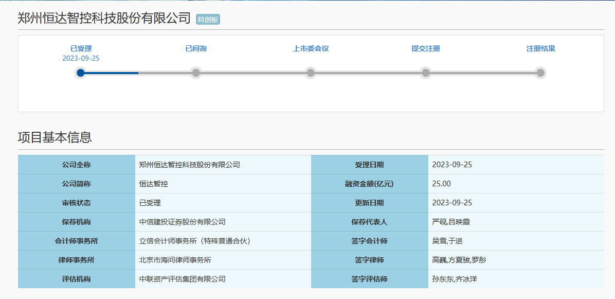 【大河财立方消息】河南又一企业科创板IPO获受理。9月25日,上交所发行上市审核信息显示,郑州恒达智控科技股份有限公司(公司简称“恒达智控”)科创板IPO已获受理。审核状态信息显示,恒达智控拟募资金额25亿元,保荐机构为中信建投证券股份有限公司。