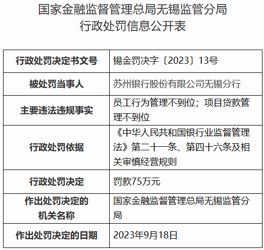 【大河财立方消息】9月26日消息,苏州银行股份有限公司无锡分行日前因员工行为管理不到位、项目贷款管理不到位,被国家金融监督管理总局无锡监管分局处罚款75万元。