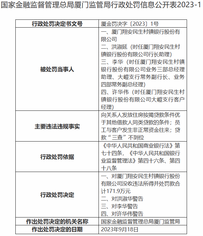 【大河财立方消息】9月27日消息,厦门翔安民生村镇银行股份有限公司因向关系人发放住房按揭贷款条件优于其他借款人同类贷款的条件、员工与客户发生非正常资金往来、贷款“三查”不到位,日前被国家金融监督管理总局厦门监管局罚没171.9万元。洪淑华、李华、许华伟三人对此负有责任,被予以警告。