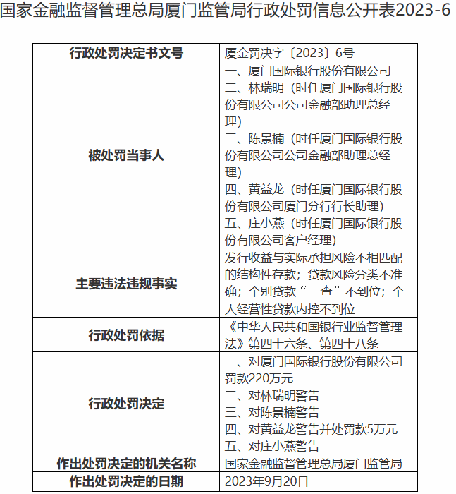 【大河财立方消息】9月27日消息,厦门国际银行股份有限公司因发行收益与实际承担风险不相匹配的结构性存款、贷款风险分类不准确、个别贷款“三查”不到位、个人经营性贷款内控不到位,日前被国家金融监督管理总局厦门监管局开出220万元罚单。林瑞明、陈景楠、庄小燕被予以警告,黄益龙被予以警告并处罚款5万元。