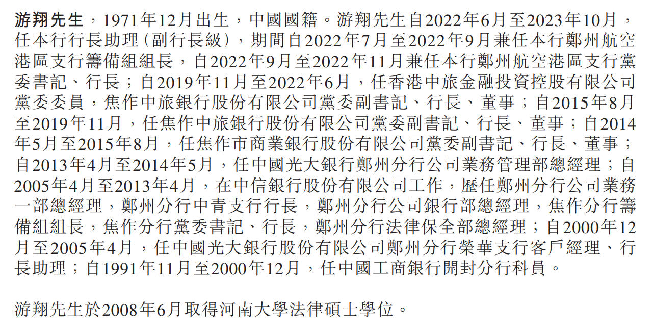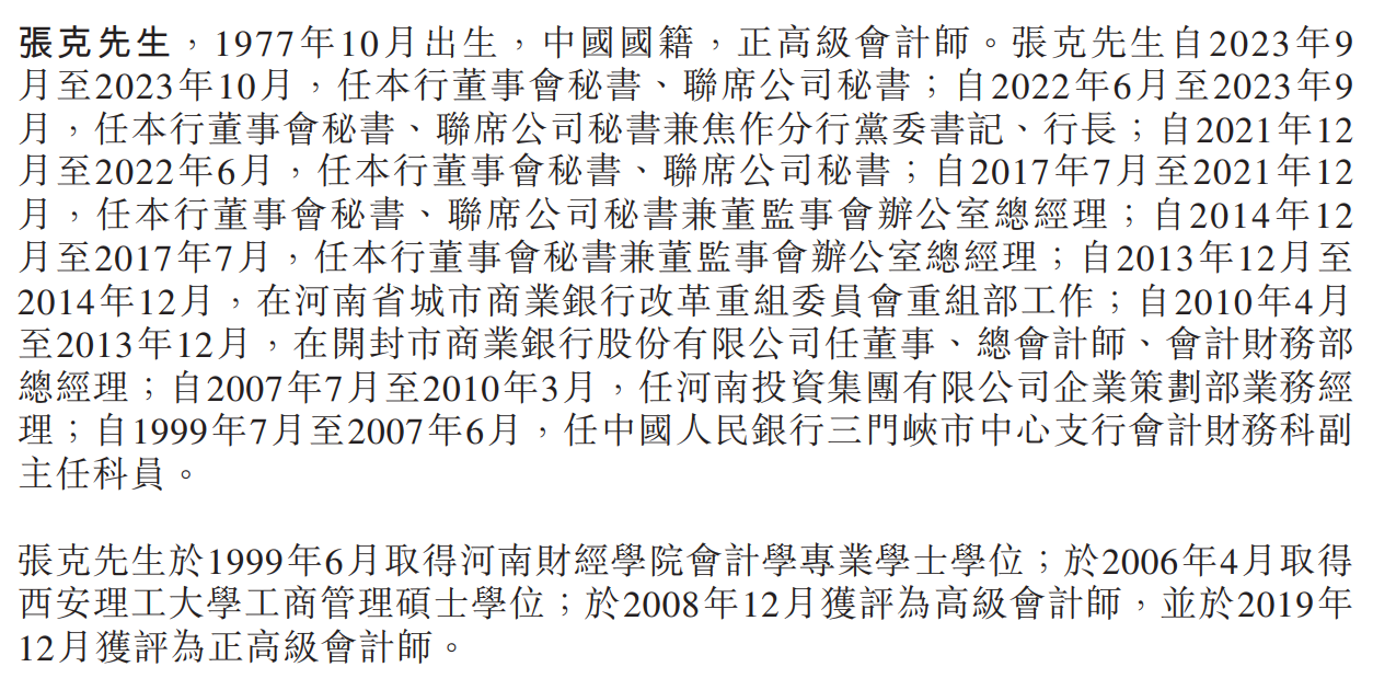 同日公告,中原银行第三届监事会第一次会议选举游翔出任监事会主席,张克出任监事会副主席,任期与第三届监事会任期一致,自2023年10月12日起生效。