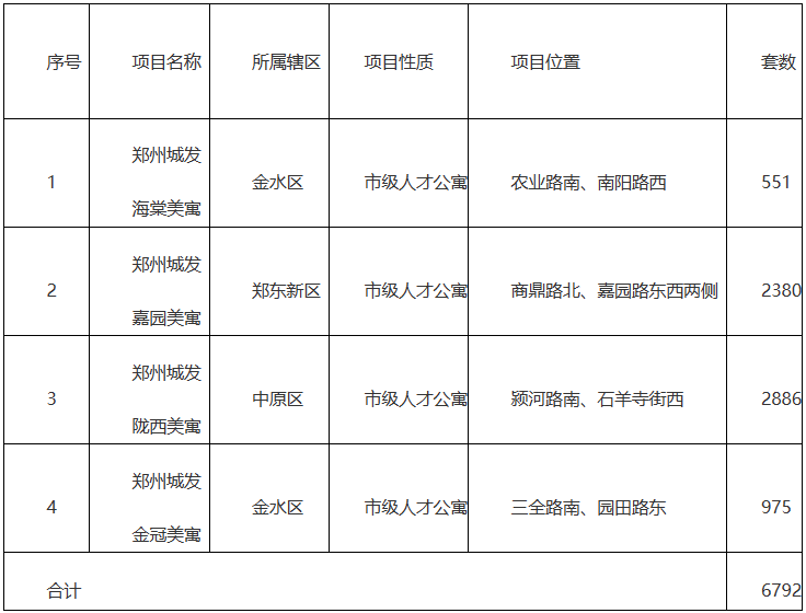 【大河财立方消息】10月13日,郑州市住房保障和房地产管理局公布了郑州市第七批人才公寓配租方案,包括4个项目,共计6792套房源,定于10月18日08:00将房源上线“郑州市保障性租赁住房(人才公寓)系统”进行配租。