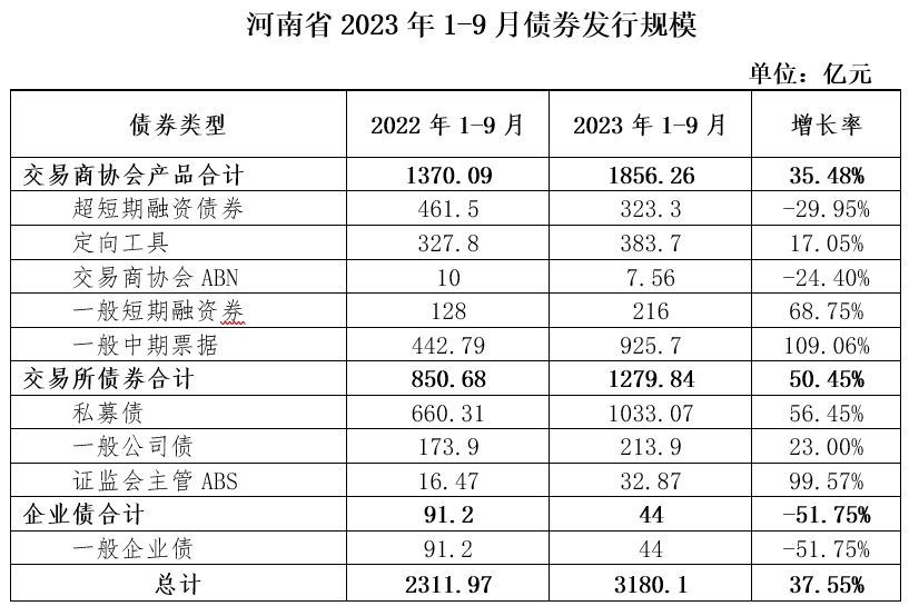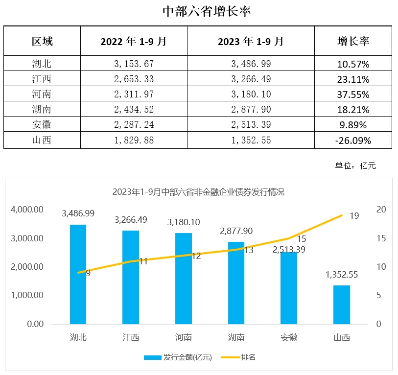 2023年前三季度,全省非金融企业发行信用债496只,发行规模3180.10亿元(不含境外债),与去年同期相比增长37.55%,增长率位居中部六省第一。发行金额在全国排名第12位,较2022年底上升4位;在中部六省排名第3位,较2022年底上升2位。
