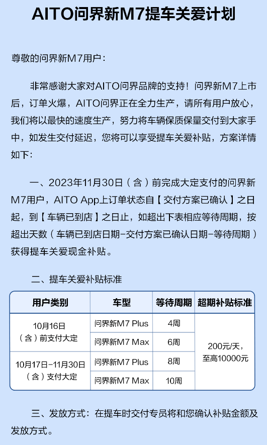 2023年11月30日(含)前完成大定支付的问界新M7用户,AITO App上订单状态自【交付方案已确认】之日起,到【车辆已到店】之日止,如超出下表相应等待周期,按超出天数(车辆已到店日期-交付方案已确认日期-等待周期)获得提车关爱现金补贴。