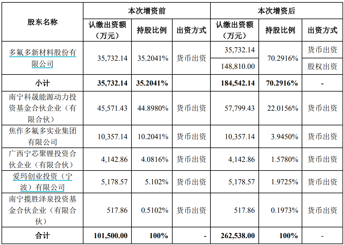 经广西宁福各股东方共同协商后,一致同意多氟多、南宁科晟能源动力投资基金合伙企业(有限合伙)(简称“南宁科晟”)以1.18元/每注册资本的价格认购本次新增注册资本。其中多氟多以持有的多氟多新能源科技有限公司(简称“多氟多新能源”)94.28%股权作价17.56亿元对广西宁福增资,认购广西宁福14.88亿元新增注册资本;南宁科晟以货币1.44亿元对广西宁福增资,认购广西宁福1.22亿元新增注册资本。广西宁福其他股东放弃本次增资的优先认购权。