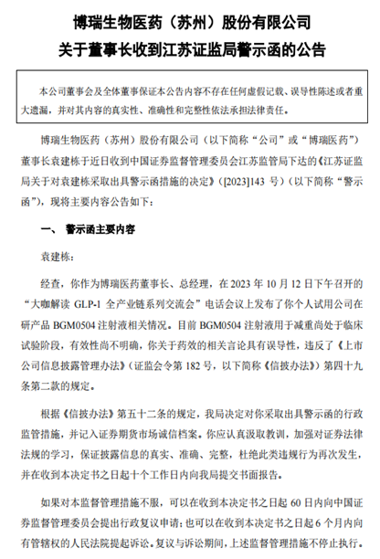 警示函称,BGM0504注射液目前用于减重尚处于临床试验阶段,有效性尚不明确,袁建栋相关言论具有误导性,违反了《上市公司信息披露管理办法》规定。对此,江苏证监局决定对袁建栋采取出具警示函的行政监管措施,并记入证券期货市场诚信档案。