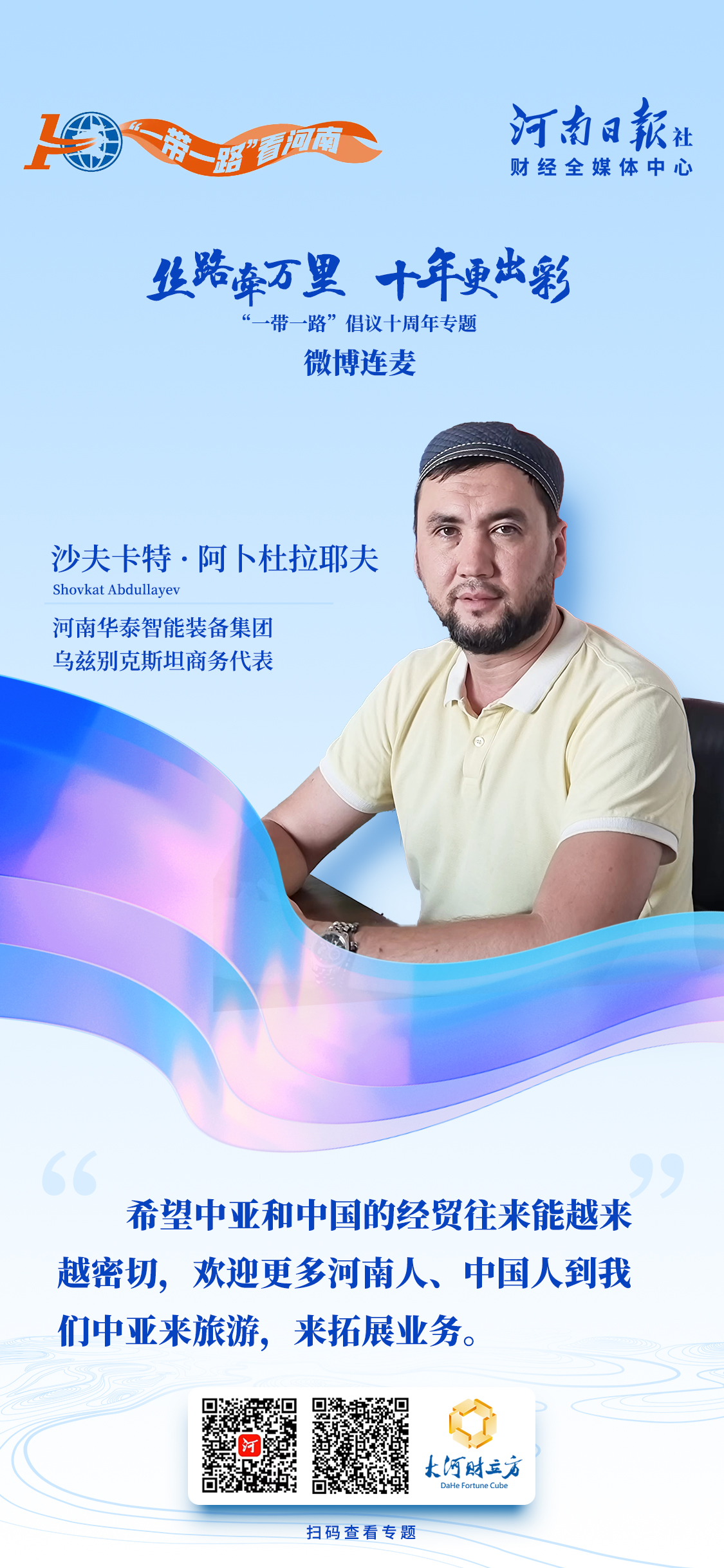 “自从‘一带一路’倡议提出以来,河南很多大企业都愿意来乌兹别克斯坦寻找合作机会,我们当地很认可‘河南制造’。”