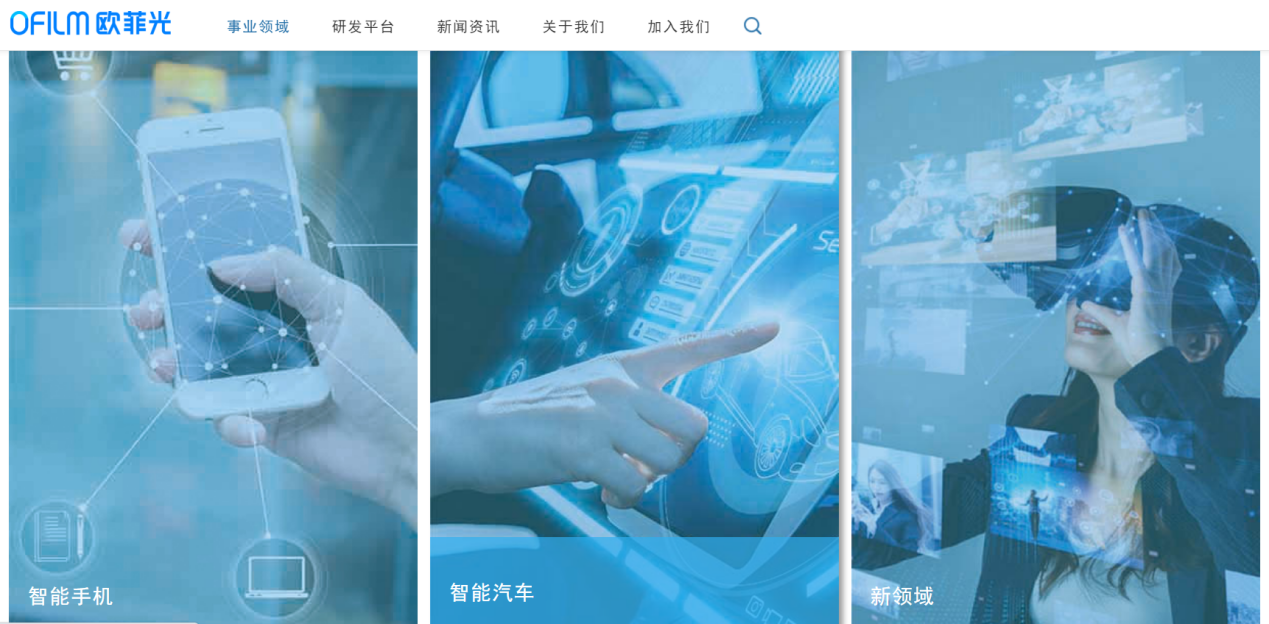欧菲光2010年在深交所上市,主营智能手机、智能汽车及新领域业务,产品包括光学影像模组、光学镜头、微电子及智能汽车相关产品等,应用于以智能手机、智能家居及智能VR/AR设备等为代表的消费电子和智能汽车领域。