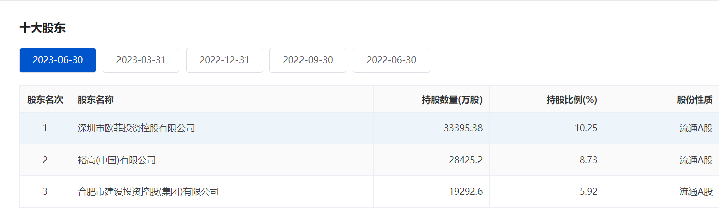 合肥建投入股欧菲光,要追溯至2021年参与欧菲光定增,认购1.93亿股公司股份成为第三大股东,截至2023年6月底持股比例5.92%。