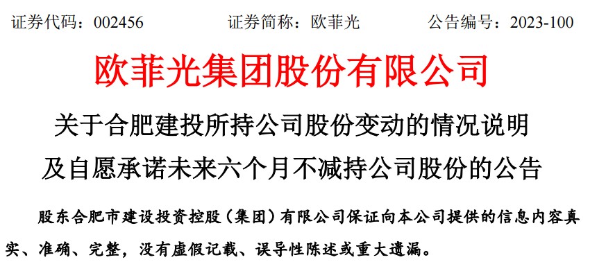 欧菲光公告称,鉴于合肥建投所持有公司股份,全部来自2021年参与认购非公开发行的新股,不适用于减持新规有关规定,无需进行减持预披露。