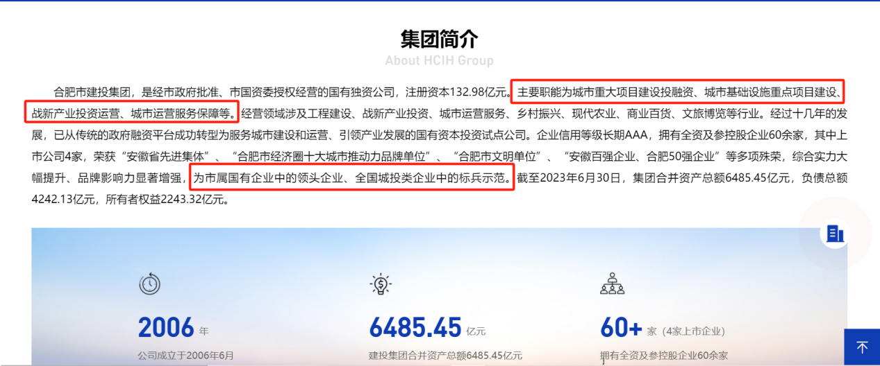 公司官网显示,合肥建投是经合肥市政府批准、市国资委授权经营的国有独资公司,已从传统政府融资平台转型为服务城市建设和运营、引领产业发展的国有资本投资试点公司。