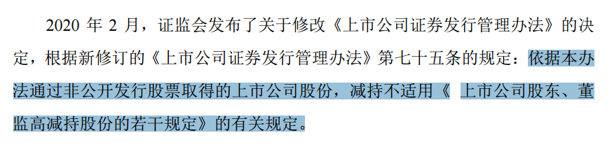 2020年2月,中国证监会修订《上市公司证券发行管理办法》规定,依据本办法通过非公开发行股票取得的上市公司股份,减持不适用减持新规的有关规定。