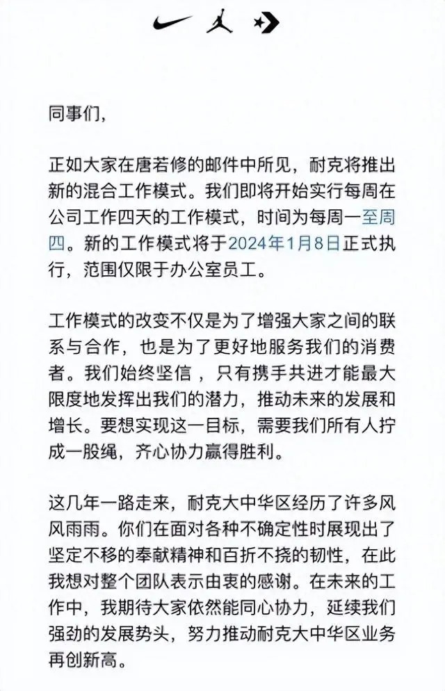 近日,随着耐克大中华区一封内部信流出,耐克将执行“新的混合工作模式”引发网友热议。有网友将此举解读为“耐克大中华区宣布将实行四天工作制”。